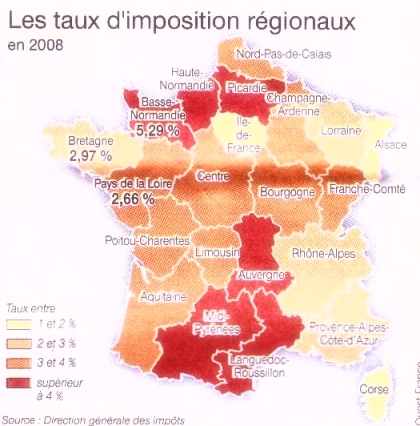 5,29 % c'est le taux moyen des taxes foncières en Basse-Normandie de très loin le plus mauvais chiffre qui fait de la région la vingt-sixième et dernière en France métropolitaine et Dom-Tom. En comparaison, le taux en Corse est de 1,02 % et en Ile-de-France de 1,27 %. Entre 2003 et 2008 l'augmentation des taux était de 23,31 % en Basse-Normandie (13e région sur 26) alors que la Corse et la Martinique étaient stables et le Languedoc Roussillon explosait ses taux de 87,06 %, la Guadeloupe de 78,08 % et l'Auvergne de 62,72 %. Quant aux départements bas normands les taux dans la Manche (64e sur 100) sont de 13,03 % ; dans le Calvados (71e) de 13,69 % et dans l'Orne (96e) de 19,53 %.