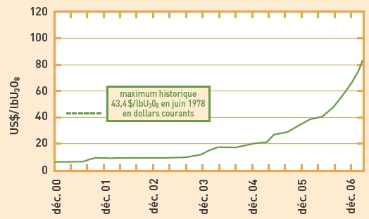 En 2007, [2, 3] la consommation d'uranium n'était couverte qu'à hauteur de 50 à 60% par la production minière. Le complément étant constitué d'uranium issu des armes nucléaires démantelées ou de stocks accumulés. Cette insuffisance de la production n'est pas sans rapport avec l'augmentation du cours de l'uranium ces cinq dernières années. Tant que l'offre ne correspondra pas à la demande le prix de l'uranium restera élevé avec potentiellement un risque de pénurie d'ici 2020 [8]. Le nucléaire dans la situation de production actuelle, et étant donnés les investissements nécessaires pour augmenter l'exploitation minière, ne pourra pas participer au doublement annoncé de la production d'électricité dans le monde d'ici à 2050.