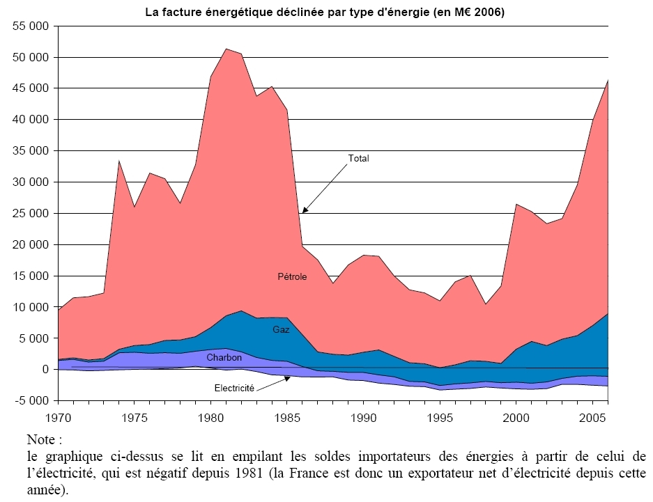 La France reste dépendante des importations de combustibles pour sa consommation énergétique globale (pétrole, gaz, charbon) [14]. La facture de ces importations est de plus en plus élevée comme l'illustre le graphique ci-dessous. Si la France est exportatrice nette d'électricité depuis 1981, il n'en reste pas moins que la production d'énergie nucléaire par les centrales actuelles dépend de l'importation de minerai d'uranium.